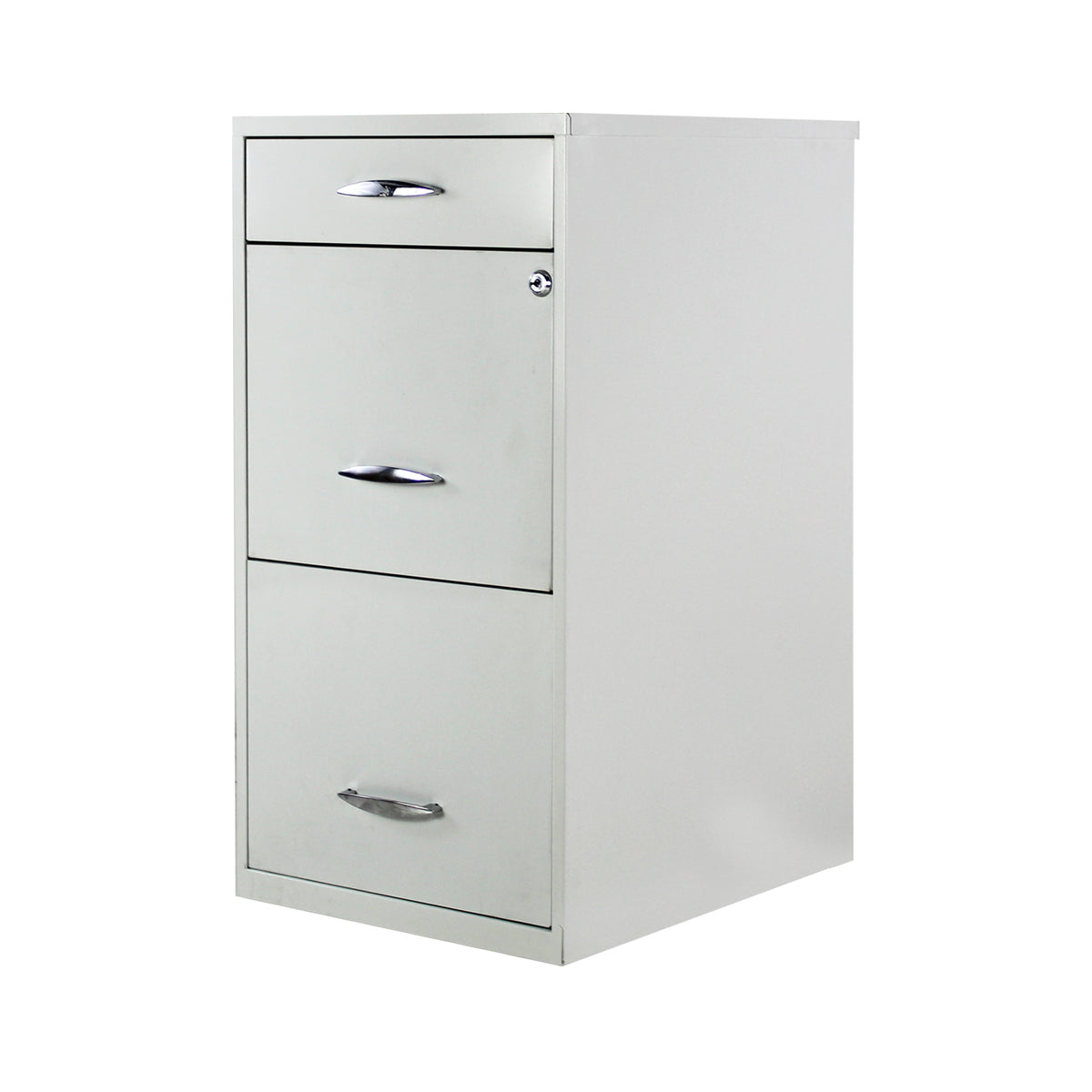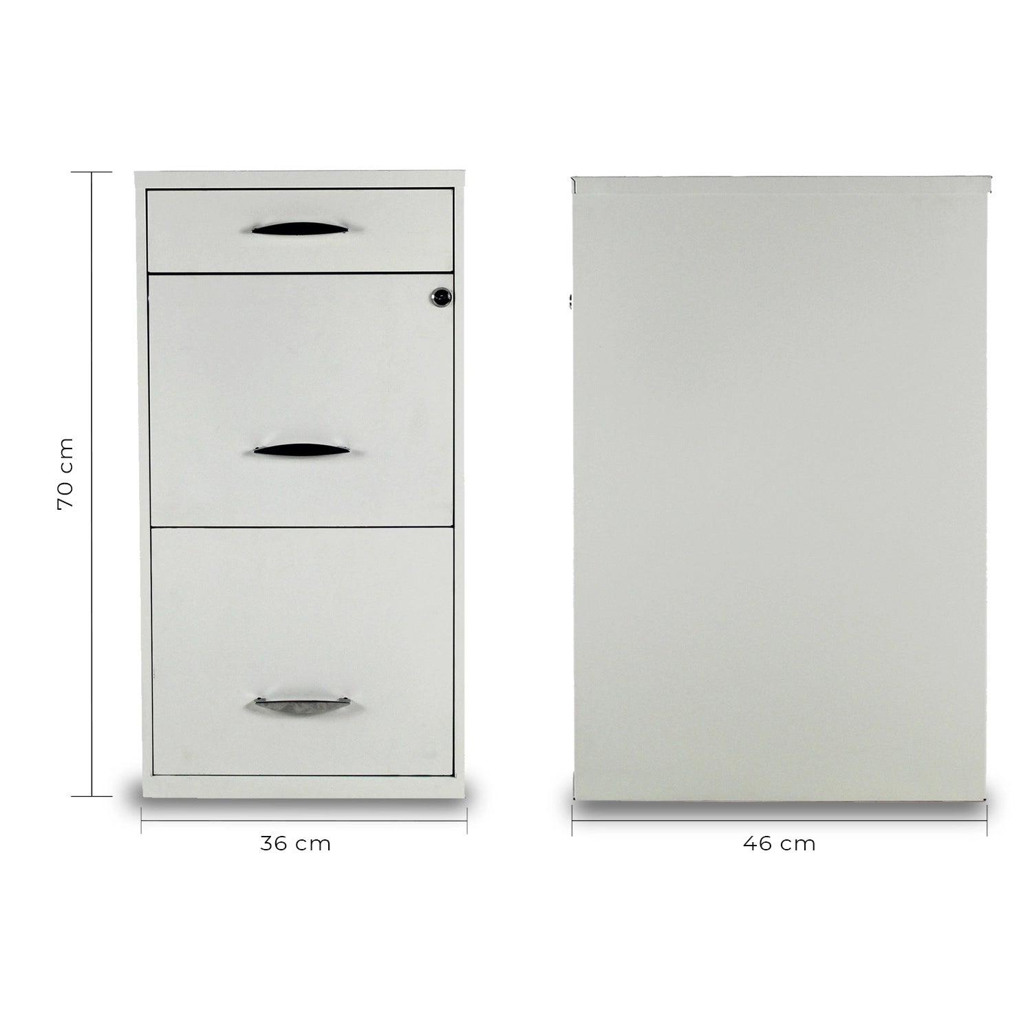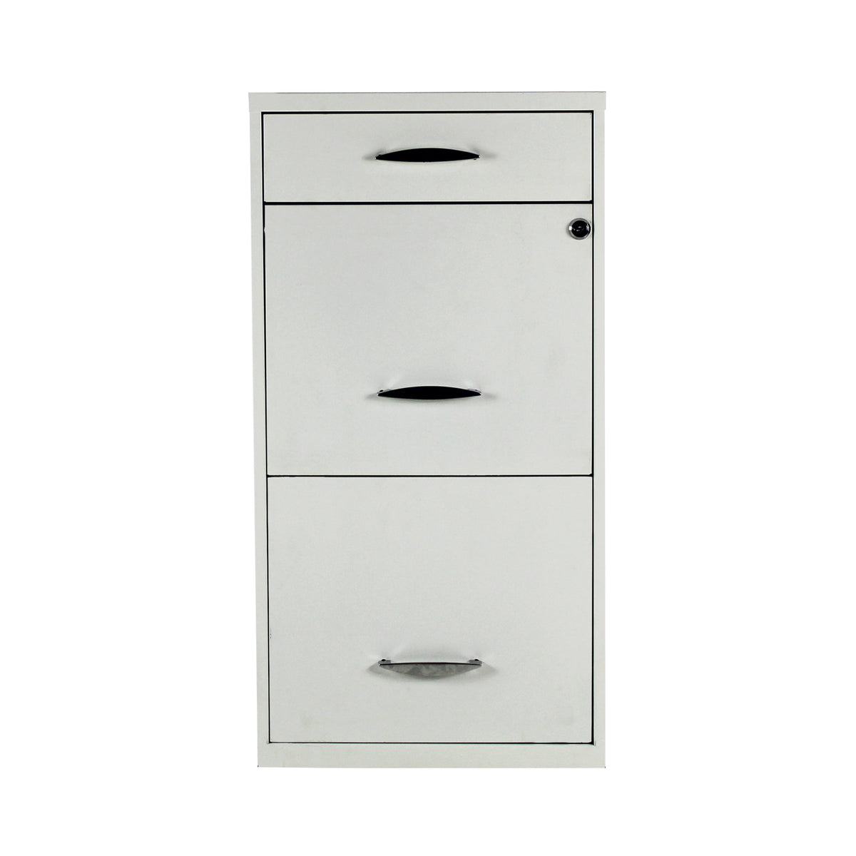 Optimiza el almacenamiento en tu oficina o estudio con el Archivero Metálico modelo 18871 de Mundo In. Con un diseño elegante en color blanco, este mueble cuenta con dos cajones superiores para papelería y una amplia gaveta inferior para documentos tamaño carta. Su estructura metálica garantiza resistencia, mientras que su cerradura integrada brinda seguridad. Ideal para oficinas modernas que buscan orden y estética.