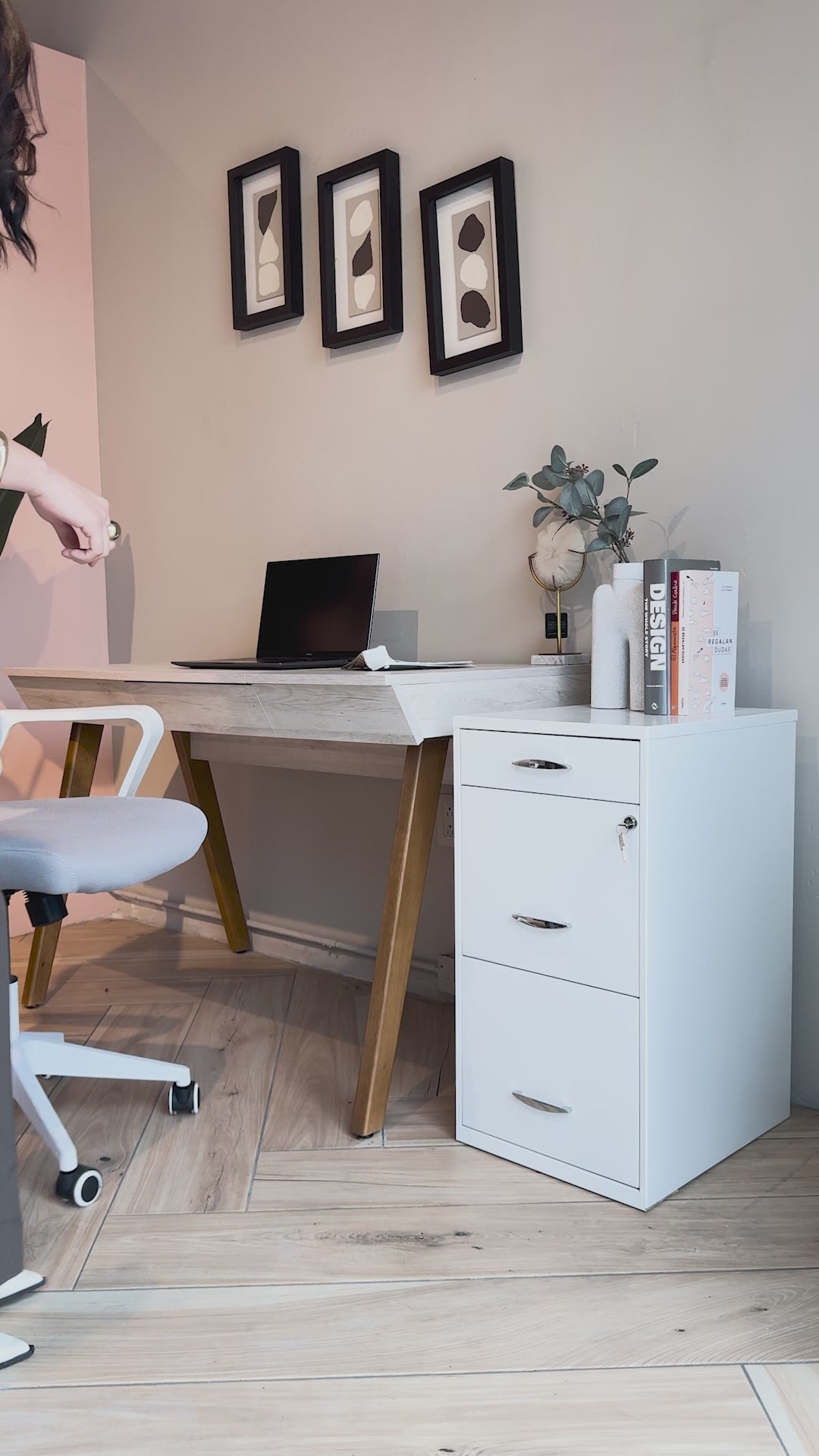 Diseño 2+1 para organización eficiente: Dos cajones superiores ideales para artículos de oficina o accesorios, y una gaveta inferior con rieles para carpetas colgantes tamaño carta.