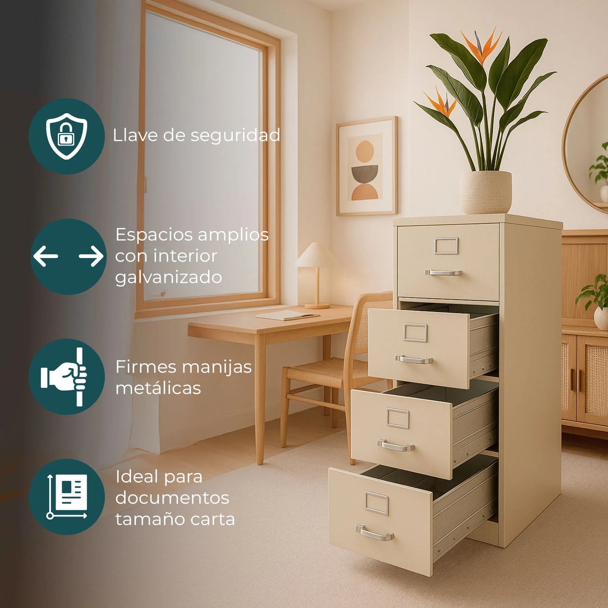 - GRAN CAPACIDAD DE ALMACENAMIENTO: Cuenta con 4 gavetas espaciosas que permiten organizar carpetas tamaño carta u oficio, optimizando el espacio.