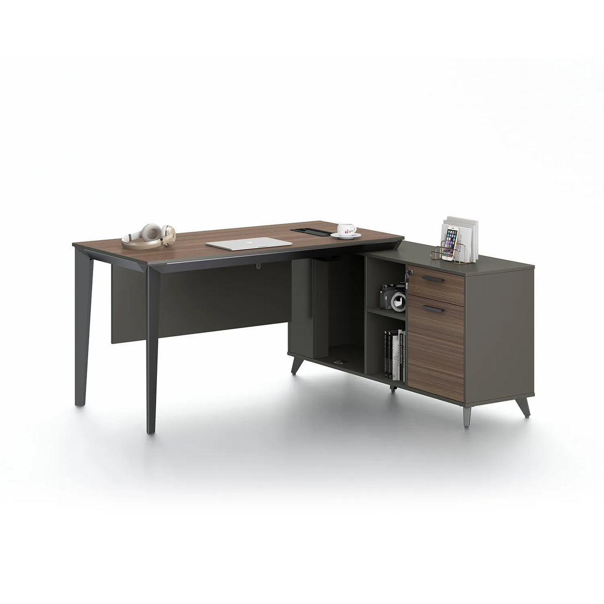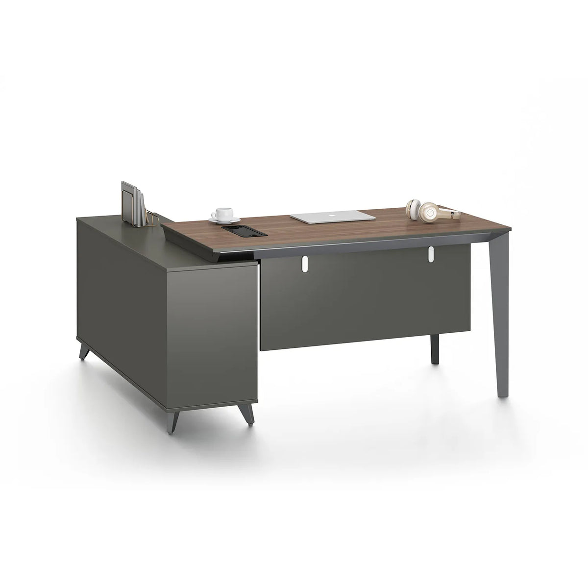 El Escritorio Ejecutivo en Forma de L Cracovia de Mundo In es una solución óptima para profesionales que buscan optimizar su área de trabajo. Este escritorio se caracteriza por su elegante acabado en gris nogal, que aporta un toque contemporáneo y sofisticado a cualquier oficina. Esta elección de color y textura es perfecta para ambientes que buscan combinar profesionalismo y diseño moderno. Fabricado con materiales de calidad, el escritorio Cracovia utiliza un tablero de partículas de grado ECO E1, destacando un compromiso con prácticas ecológicas y sostenibles.