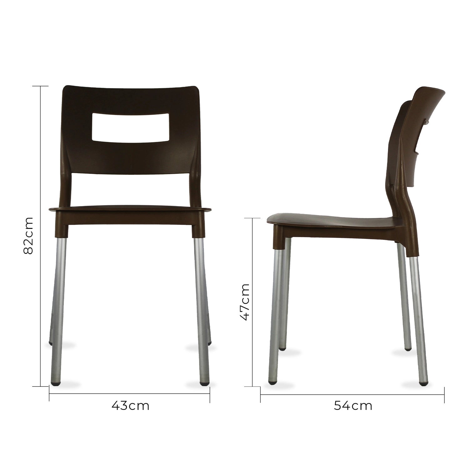 ¡Decora tu espacio con un elemento funcional y minimalista! Este kit de 4 sillas Valenia es perfecto para restaurantes, cafeterías o negocios con usos mixtos de espacios interiores y exteriores. Cada silla no solo tiene un diseño elegante y simple que combina a la perfección con distintos diseños de decoración, además cuentan con un asiento plastificado de alta resistencia y con protección UV, lo que las hace resistentes a cualquier tipo de clima; ideales para interior y exterior. El asiento está hecho de polipropileno 100% resistente y de alto impacto, mientras que las patas son de aluminio anodizado. Cada una de estas sillas soporta hasta 170 kilos. Por su diseño funcional estas sillas son apilables, lo que facilita su almacenamiento.