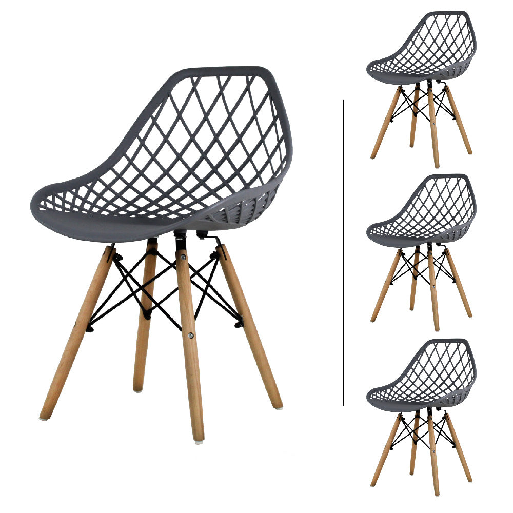 Decora tu espacio con este Set de 4 Sillas Eames Vento inspiradas en el diseño original de Charles y Ray Eames para el prestigioso concurso “Low-Cost Furniture Design”, en los años 50. Comenzando por una base de cuatro postes de madera unidos por medio de varillas entrecruzadas, un asiento de polipropileno con un toque en asiento y respaldo de rombos orgánicos en forma de torbellino, lo adaptará en el elemento ideal para sumar a cualquier tipo de espacio una dosis Perfecta comodidad y buen diseño.