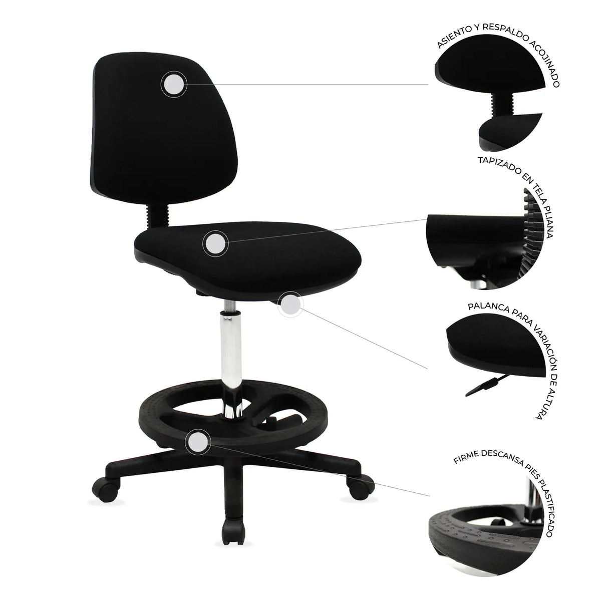 Diseño funcional para estaciones de trabajo altas: Perfecta para cajeros, recepcionistas y mostradores, la Silla Cajero 007 permite trabajar cómodamente en superficies elevadas gracias a su estructura ajustable y su aro descansa pies.