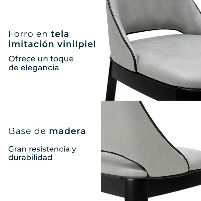- Asiento: acolchonado con tapizado en vinipiel, brindando confort y fácil mantenimiento.