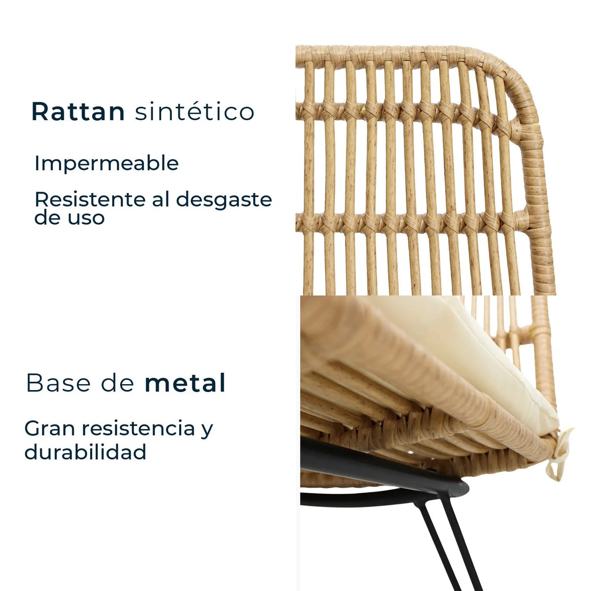 Cuidado de los soportes metálicos: • Limpia con paño suave. • Si hay polvo acumulado, usa un cepillo de cerdas suaves. • Ajusta tornillos o uniones según sea necesario. • No uses cloro ni productos abrasivos. • Si está en exterior, cúbrelo o guárdalo cuando no esté en uso para prolongar su vida útil. • Evita dejarlo expuesto al sol o lluvia directa durante periodos prolongados, aunque sea resistente. Cuidados del Asiento: • Aspira o sacude regularmente para evitar polvo o residuos. • No uses vapor directo o productos fuertes que puedan decolorar o dañar el relleno. • Evita saltar o aplicar presión excesiva sobre el cojín para conservar la forma. Cuidados básicos del Rattan: • Limpia con un paño húmedo o esponja suave con agua y jabón neutro. • Para limpieza profunda, puedes usar un cepillo de cerdas suaves entre los tejidos. • No uses cloro ni productos abrasivos. • Si está en exterior, cúbrelo o guárdalo cuando no esté en uso para prolongar su vida útil. • Evita dejarlo expuesto al sol o lluvia directa durante periodos prolongados, aunque sea resistente.