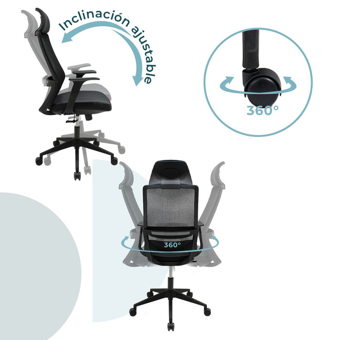 - FUNCIONES DE AJUSTE PERSONALIZADO: Sistema de reclinación con bloqueo, ajuste de altura y giro de 360°, ideal para largas jornadas de trabajo o estudio.
